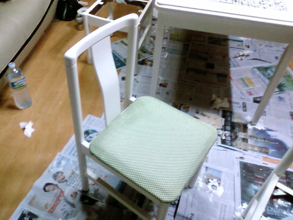 패브릭 연두/하얀땡땡이로 사서 의자 궁디 앉는 부분 천갈이하고 색상은 식탁과 마찬가지로 크림화이트로 색칠했다.